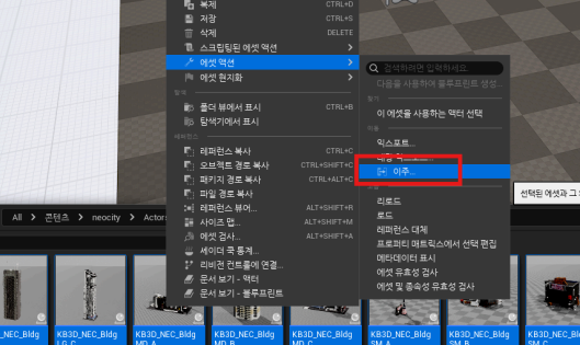 4. 강의자료에 있는 에셋 선택 후 "우클릭 > 에셋 액션 > 이주"를 통해 내 프로젝트로 가져온다.