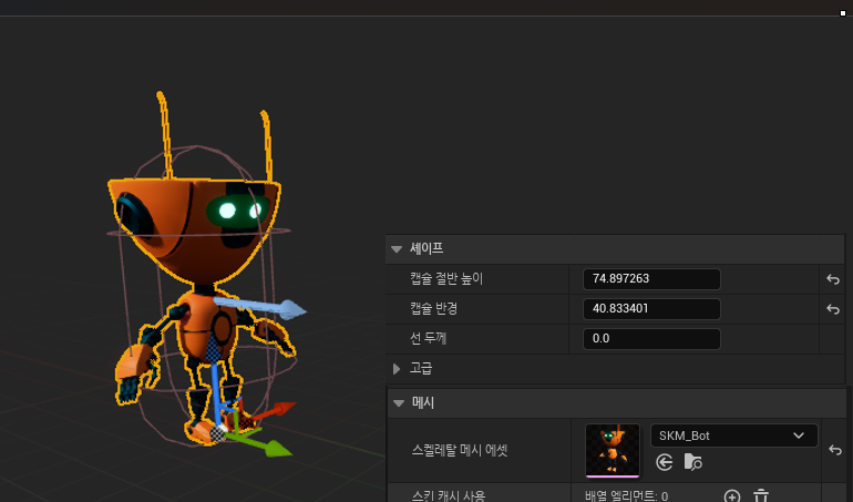 2. 메시의 스켈레말 메시 에셋을 지정 및 캡슐과의 위치및 각도 조절