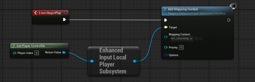 - Add Mapping Context 노드는 Enhanced Input Local Player SubSystem 핀을 끌고 와서 생성