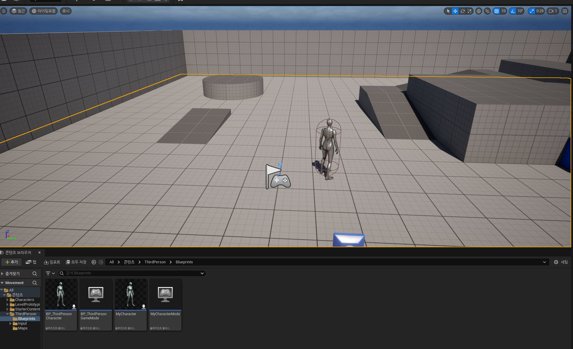 컨텐츠 드로어에 있는 MyCharacter 블루프린트를 드래그해 레벨에 배치한다.