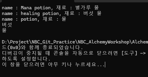 오늘은 레시피 추가, 모든 레시피 출력과 포션이름으로 검색하여 재료가 반환되는 함수를 구현 하였다.