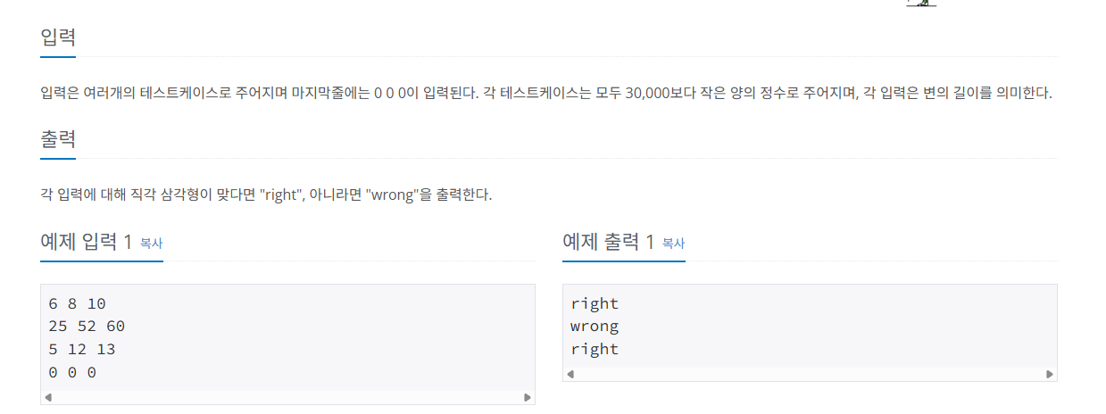 // 피타고라스의 정리로 판별 후 출력.