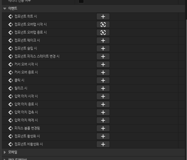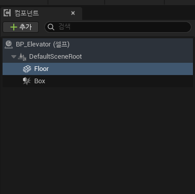 - 저장 컴파일 한후 컨텐츠 드로어에서 BP_Elevator 우클릭 후 자손 클래스로 생성후 뷰포트에서 콜리전 박스를 선택후 디테일 창 에서 컴포넌트 오버랩 시작/종료 시 를 추가 해준다.
