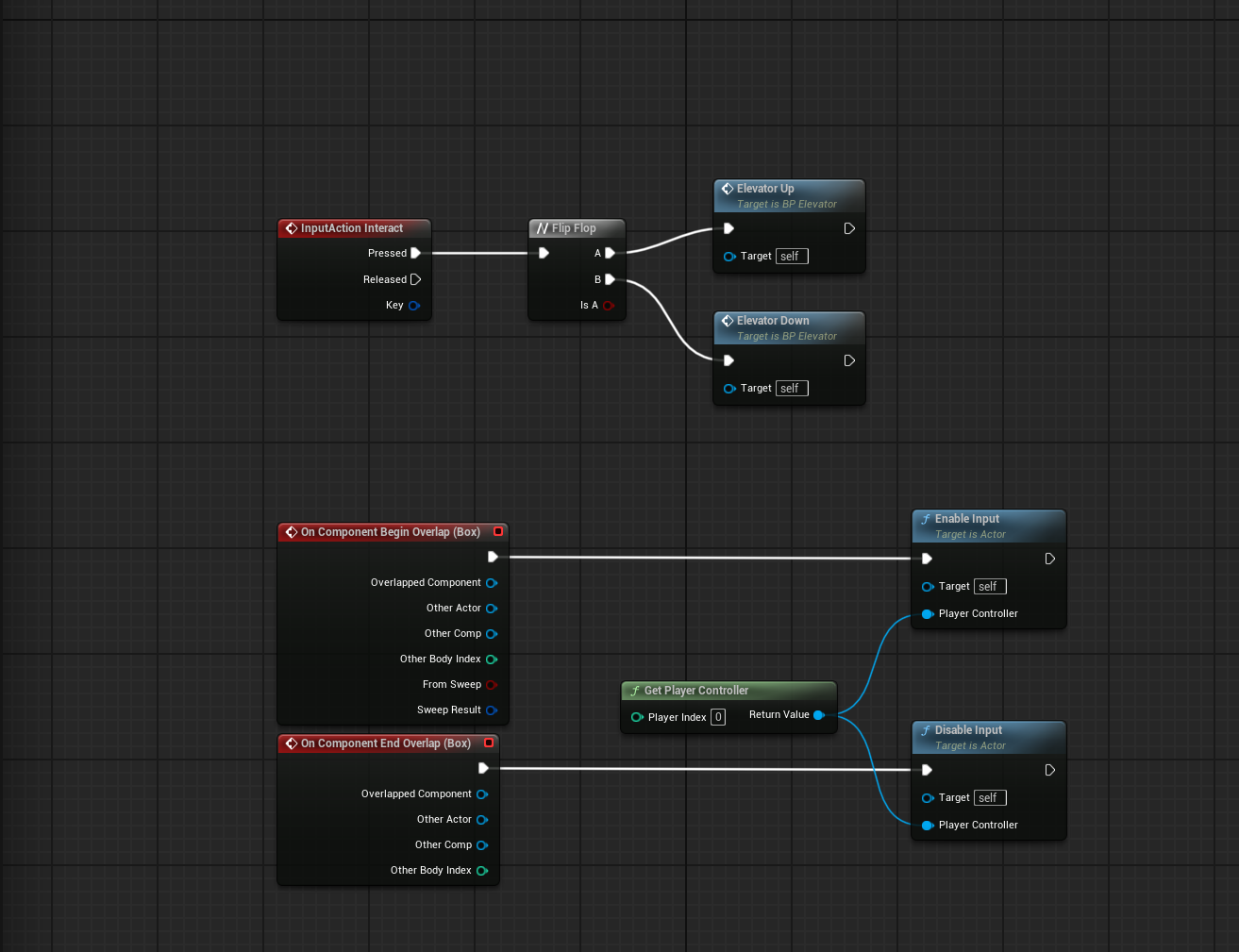 그리고 엘레베이터에 맞게 크기를 조절해주고 이벤트 그래프 창에 Add Custom Event 2개와 Add TimeLine을 생성하고 이름을 아래와 같이 변경해준다.